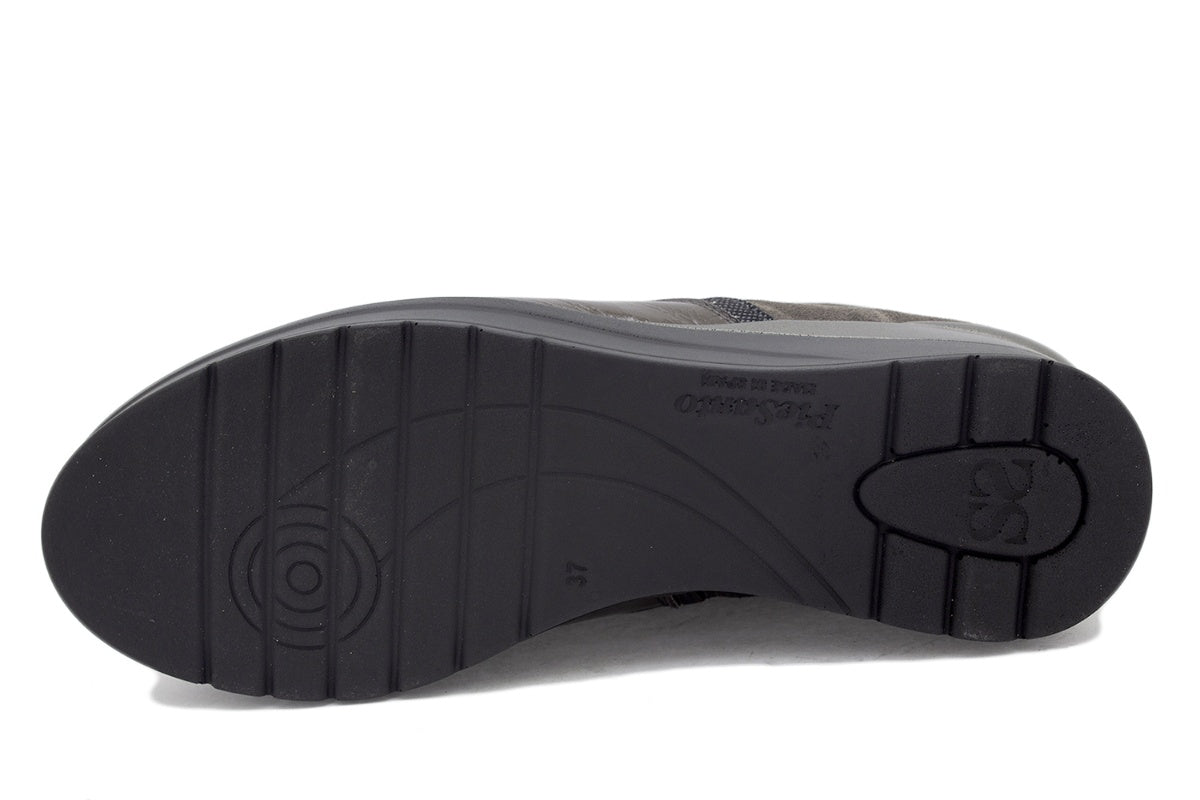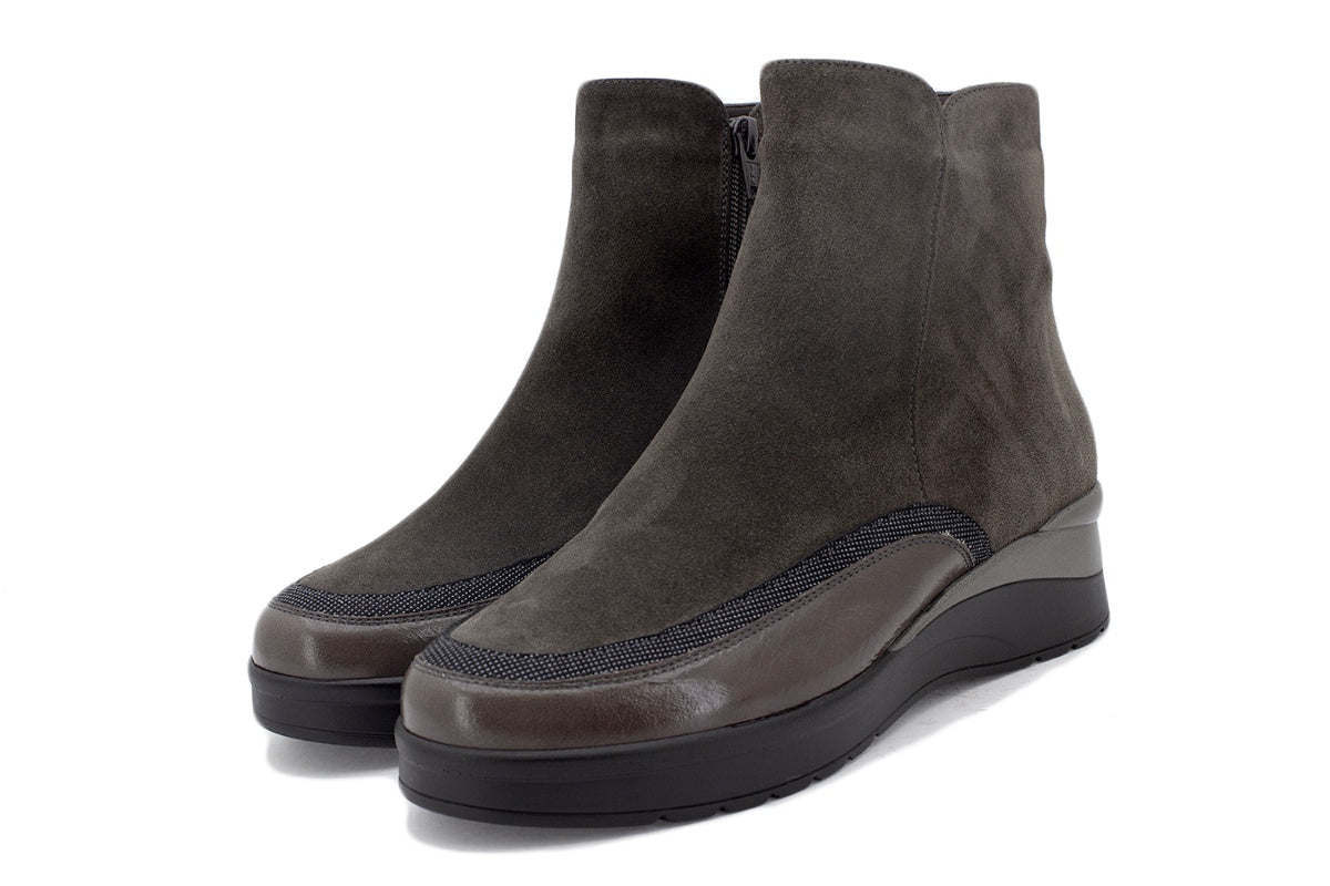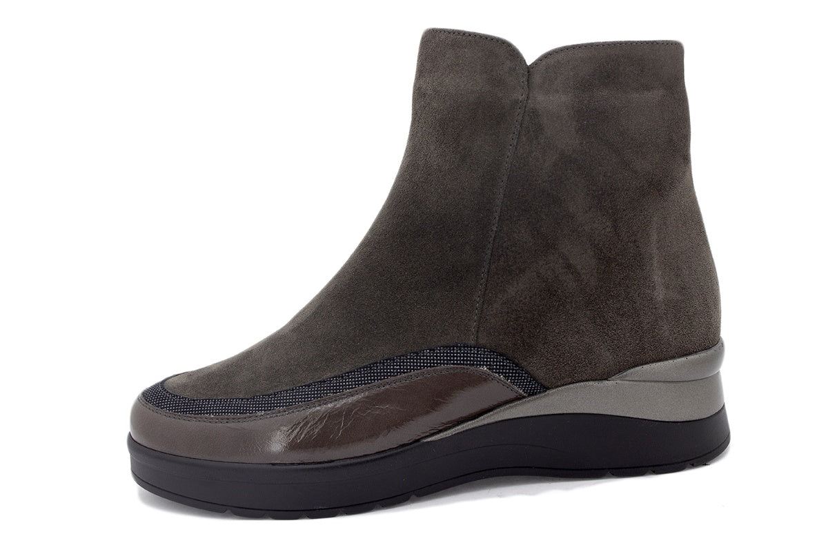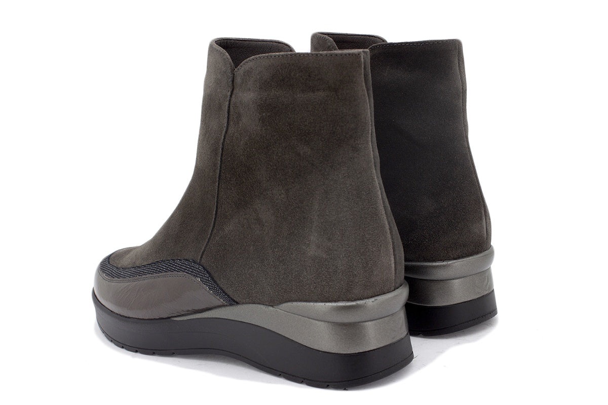 Bottes en daim gris et cuir verni à semelle épaisse, parfaites pour les femmes en quête de style et de chaleur par temps froid. Fabriquées à la main en Espagne avec des matériaux de première qualité, ces bottes sont idéales pour les pieds larges et sensibles.